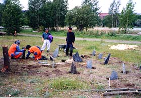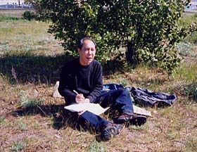 現地でスケッチをまとめる戸谷さん 次々と石が運ばれてきた。 あらかじめリクエストしておいた材料とは全く違う物が来ており、当初のプランを白紙にして現地でアイデアを練り直した戸谷さん。普段の静かな物腰とは裏腹に、お酒が入ると一気に加速、物騒な言葉がポンポン飛び出す、作家さん達からも尊敬されている作家さんです。 今回は倒木と、土に刺さった石斧という意味深な作品でした。はたしてどんな意味なんでしょうか?
