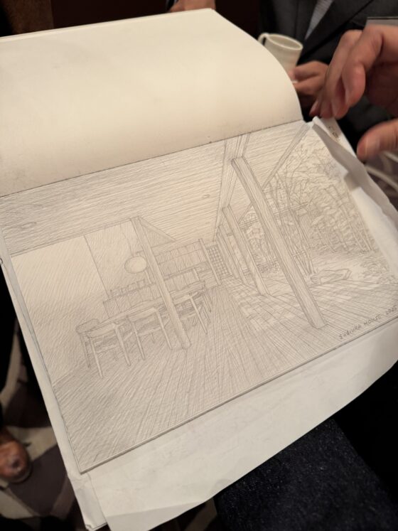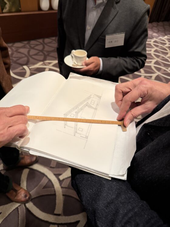 電車の中で使うというお手製の竹製T定規や、基本は1/200で描くという細かいスケッチを色々見せて頂きました。私は鉛筆一本、手描きで世界が作れる建築家はサムライだと思っていて、この筆致にその人のすべてが表れる気がします。